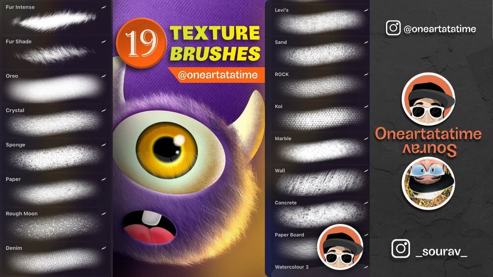 You will get 19 high quality texture brushes curated from high quality pictures along with a bonus fur brush